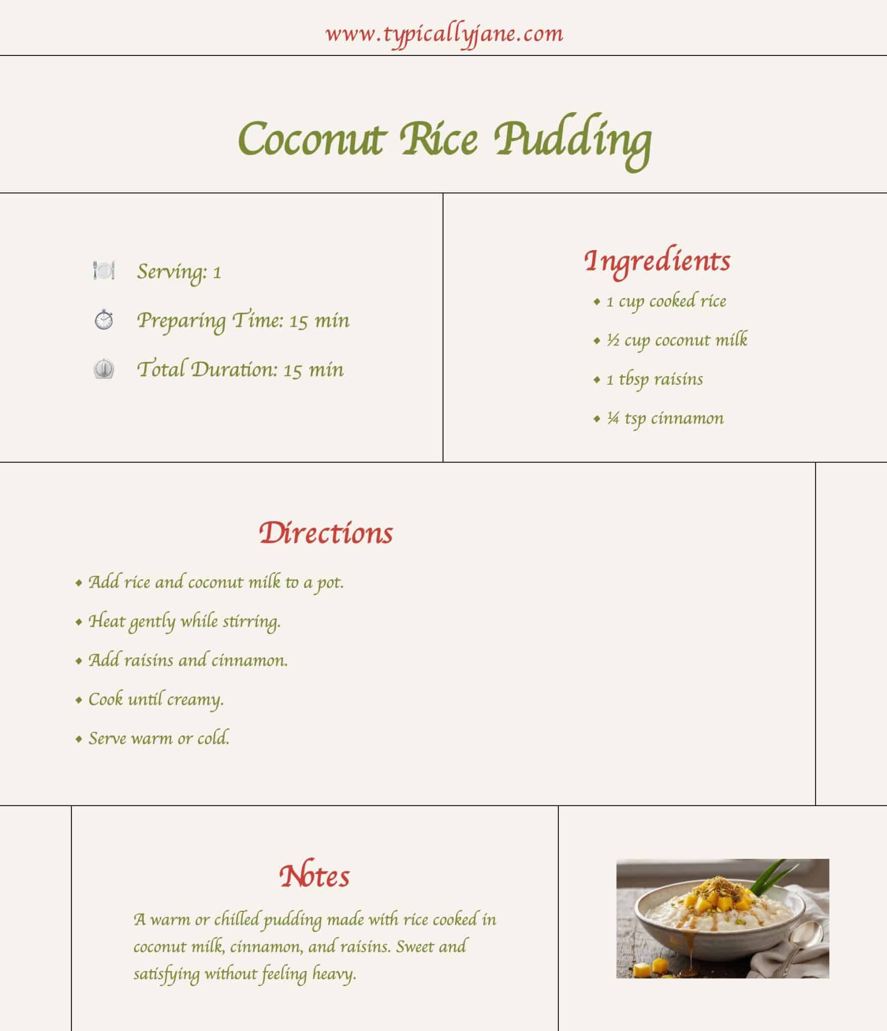 Cook rice in coconut milk with cinnamon and raisins. Serve hot or cold. Sweet without being too heavy.