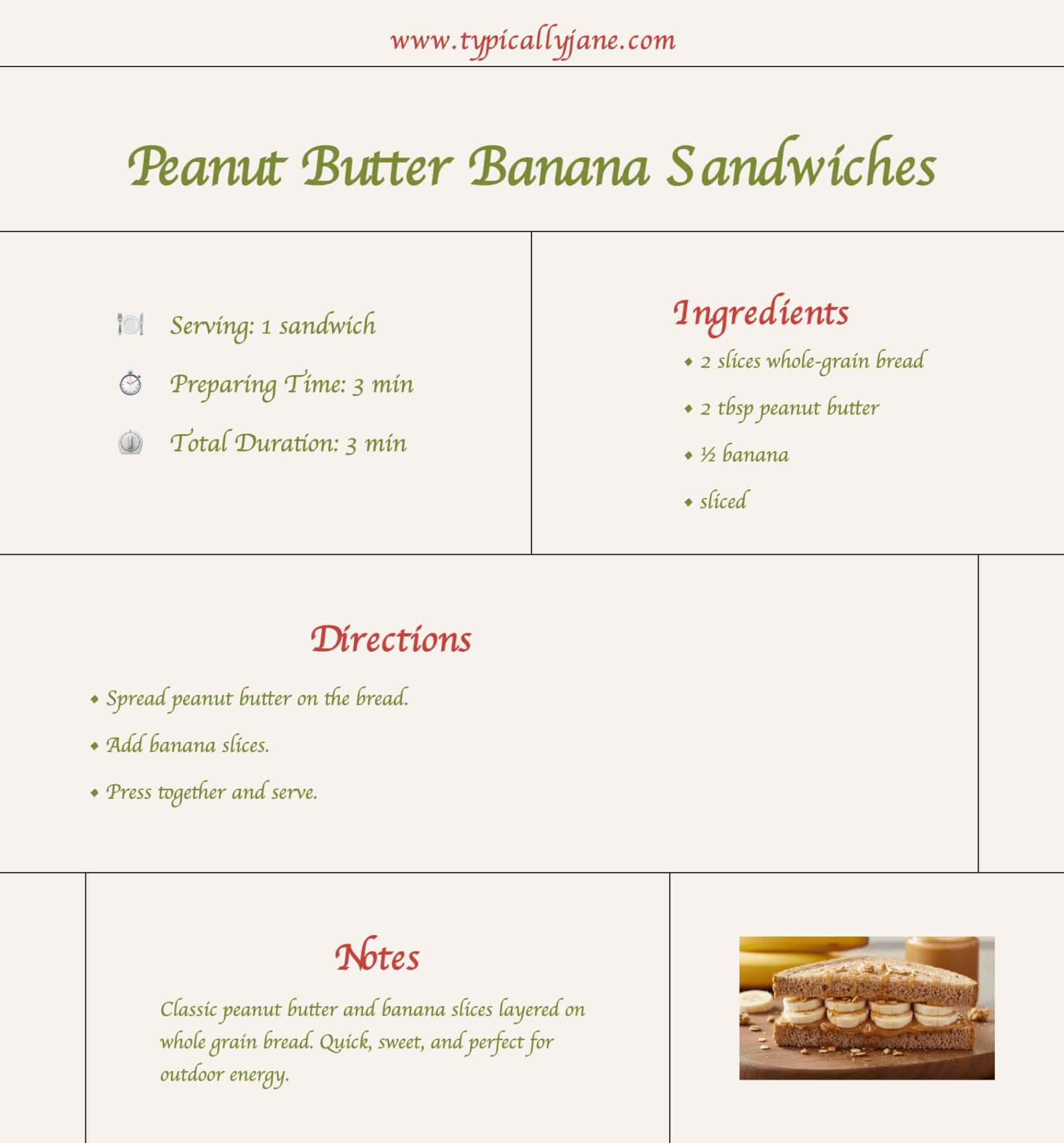 Spread natural peanut butter on whole-grain bread and add banana slices. It’s a classic that never disappoints outdoors.