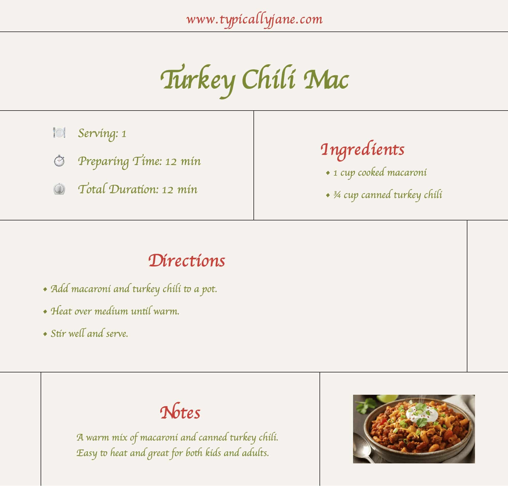 Combine cooked macaroni with turkey chili from a can. Heat it all together. Kids and adults both love it.